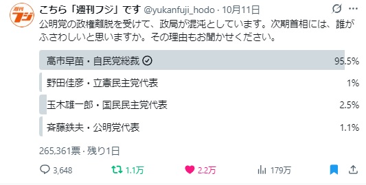 民意とは 2025.10.13 オールドメディアも野党も親中な与党議員も、高市さんが総理になる事が余程都合が悪いのでしょうね。あからさまが過ぎる。これが民意ですよ、265,000票超のアンケート結果です。(オールドメディアのアンケートなんて1,000~3,000票程度です)↓ USAID全滅 前の記事 【外国人の土地購入 法改正も視野】 次の記事